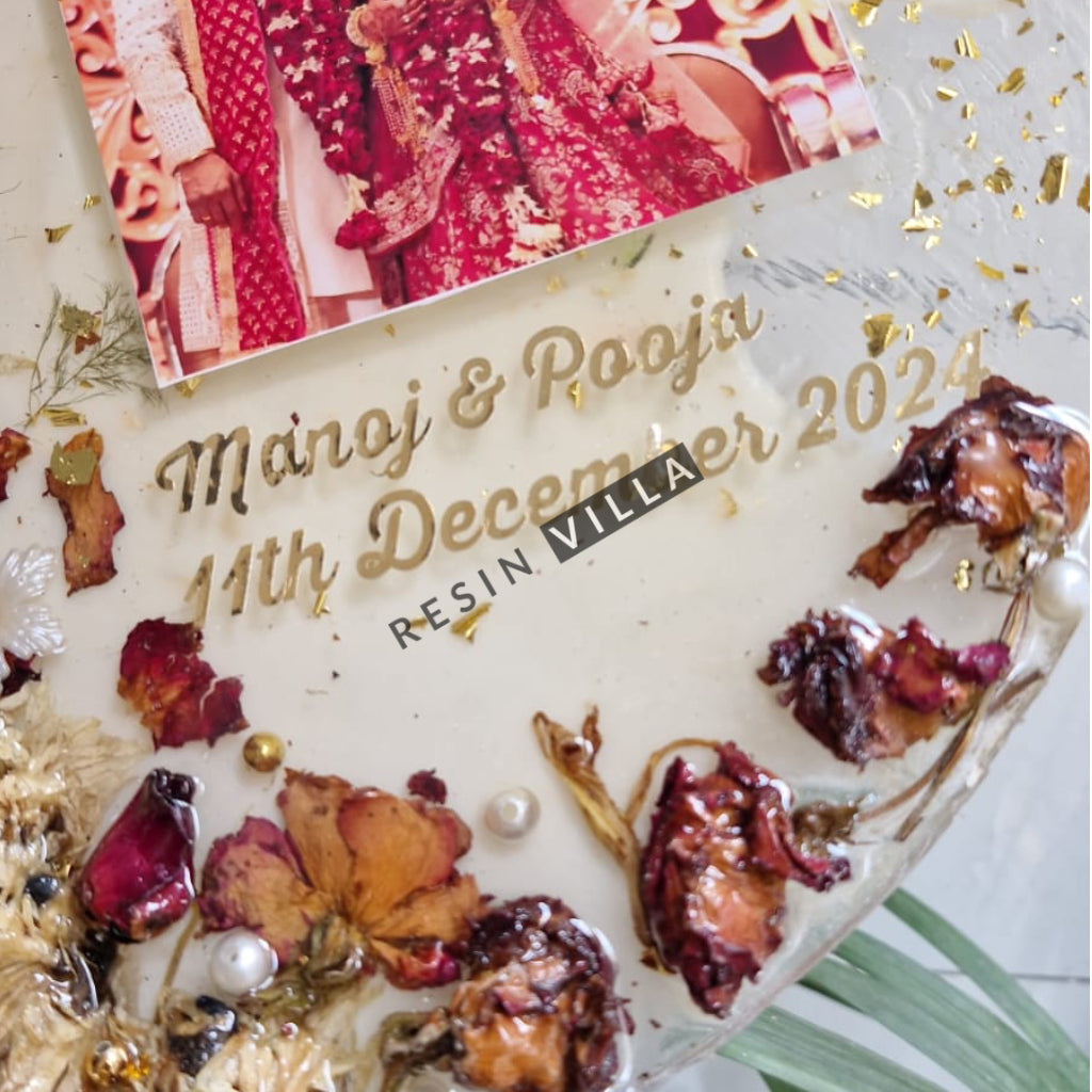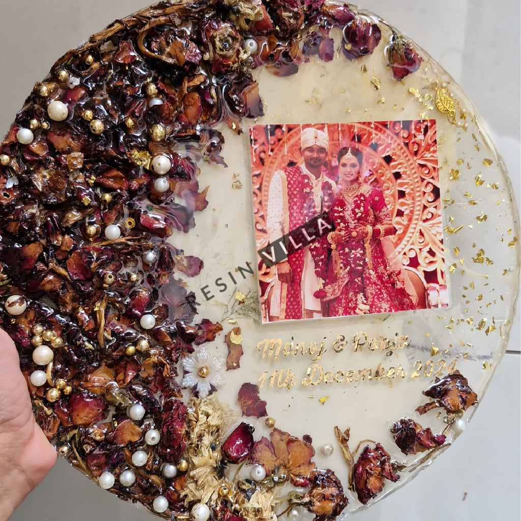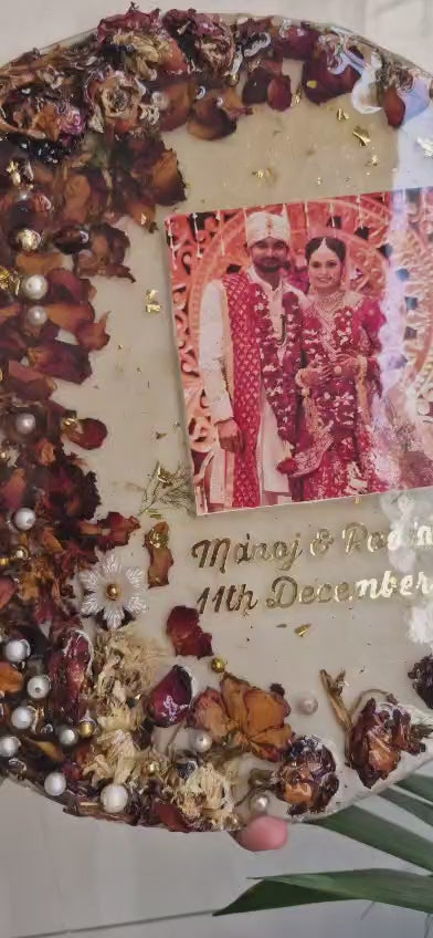 احتفظ باللحظات الخاصة مع زهور الزفاف الجميلة Varmala / Garland ذات اللون الفاتح مع شكل دائري في عمل فني من الراتينج مقاس 12 بوصة بمظهر زجاجي شفاف. مصنوعة من فن الراتينج مقاس 12 بوصة، ستعرض هذه القطعة بشكل أنيق أكاليل الزهور / Varmala العزيزة لديك لسنوات قادمة.