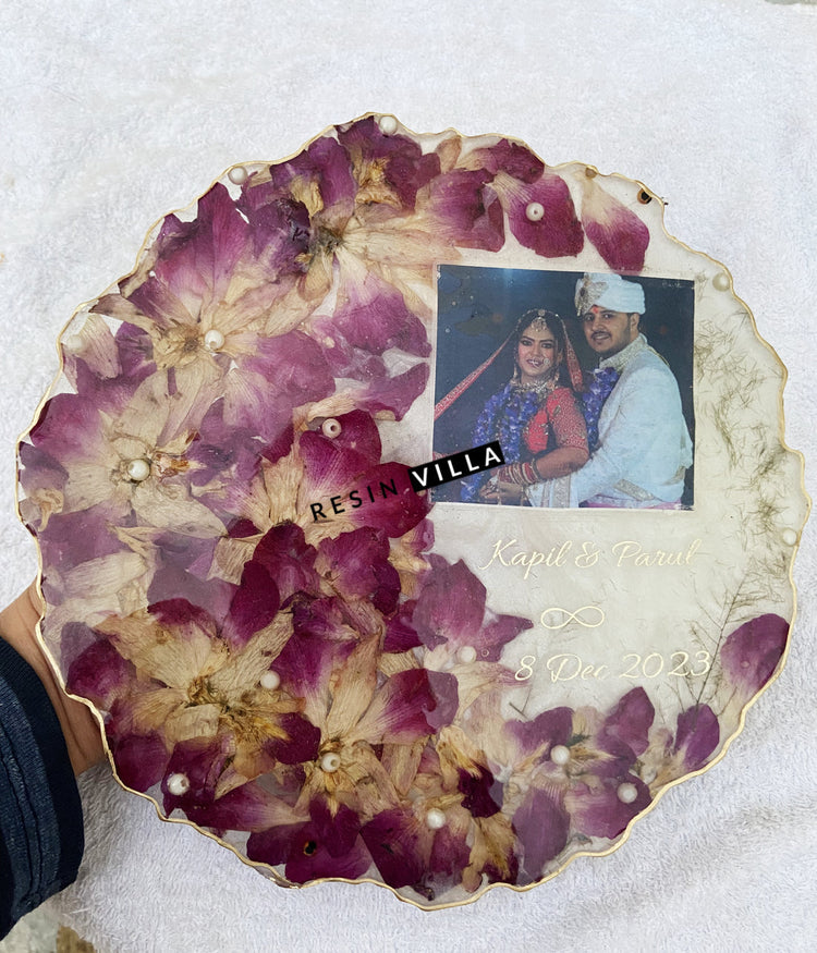 Explore our unique collection of handcrafted resin artworks that bring creativity and elegance to any space. Specialize in creating a variety of eye-catching pieces, Resin Art Customise Product includes, Personalise Resin . LED Lamp, Varmala Preservation, Varmala Preservation in Wooden Frame, Flower Preservation, Preserve Wedding Bouquet, Photo Frames, Resin Jewellery, Resin Clocks, Mantra Frames, Home Decor, Personalised Gifting, Customised Gifting, Customised Wedding Gifting, Wedding Invitation, Engagement Platter, keepsakes, wall art, and decorative items, Tray Coster vibrant coasters, captivating wall decor, and custom furniture etc, all made from high-quality materials.